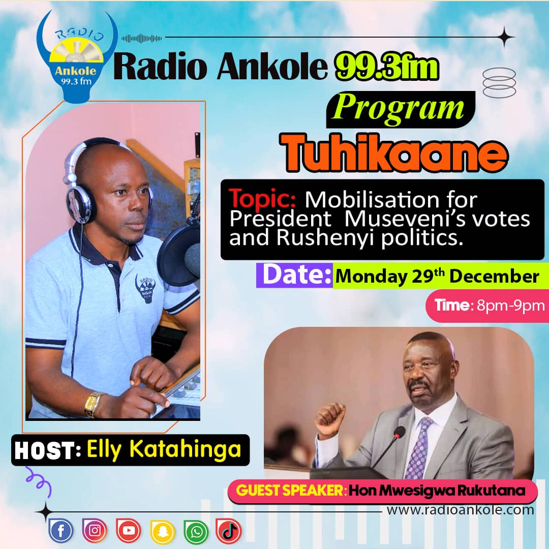 Radio Ankole, 99.3 FM Ntungamo, encourages all listeners to tune in tomorrow, between 8 and 9 PM. We look forward to your valuable listenership during this scheduled broadcast.
