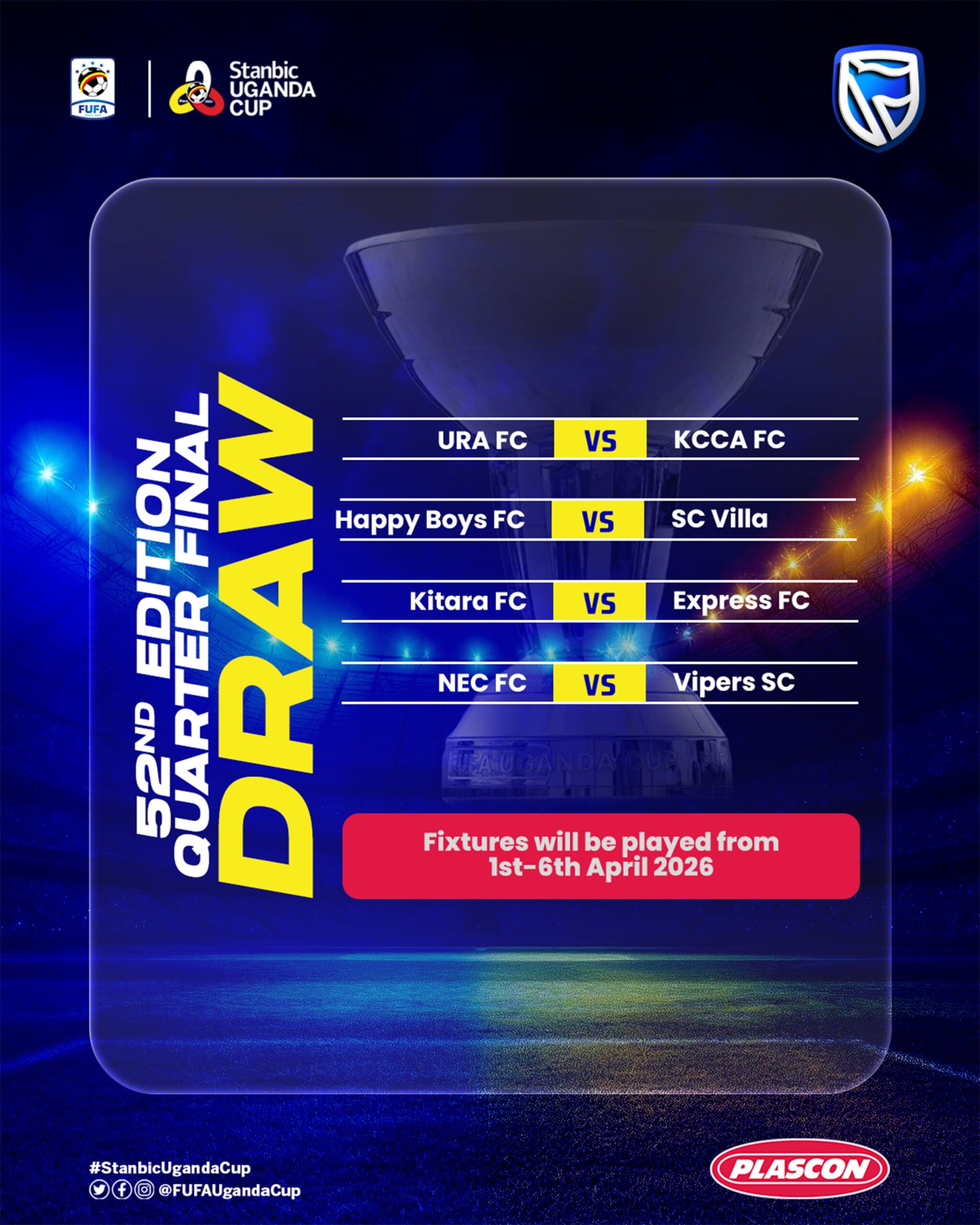 Good morning, this is Radio Ankole, 99.3 FM Ntungamo, with your sports update. The highly anticipated quarter-final draw for the Stanbic Uganda Cup has now been officially concluded. This significant development marks a crucial stage in the ongoing 52nd edition of the prestigious football tournament.