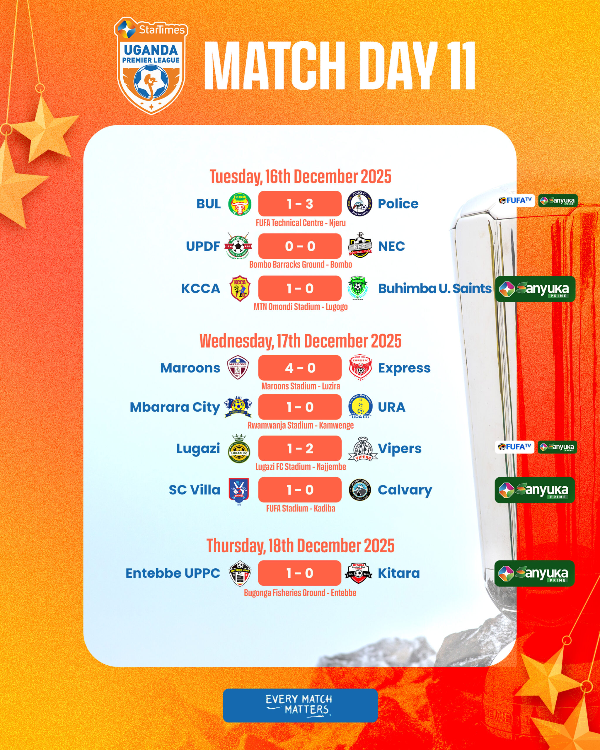 Good morning, listeners, and welcome to your Radio Ankole 99.3 FM Ntungamo news update. We bring you the latest developments from the vibrant world of Ugandan football. The StarTimes Uganda Premier League has officially concluded its eleventh match day, with all results now confirmed and available. The official channels of the Uganda Premier League have verified the completion of Match Day 11 fixtures, providing football enthusiasts across the nation with the outcomes they have been eagerly anticipating. These crucial results mark a significant point in the ongoing league season, influencing team standings and setting the stage for future encounters. Fans are encouraged to review the comprehensive details of all the scores from this latest round of games, as the competition continues to intensify. Stay tuned to Radio Ankole for more sports news and analysis.