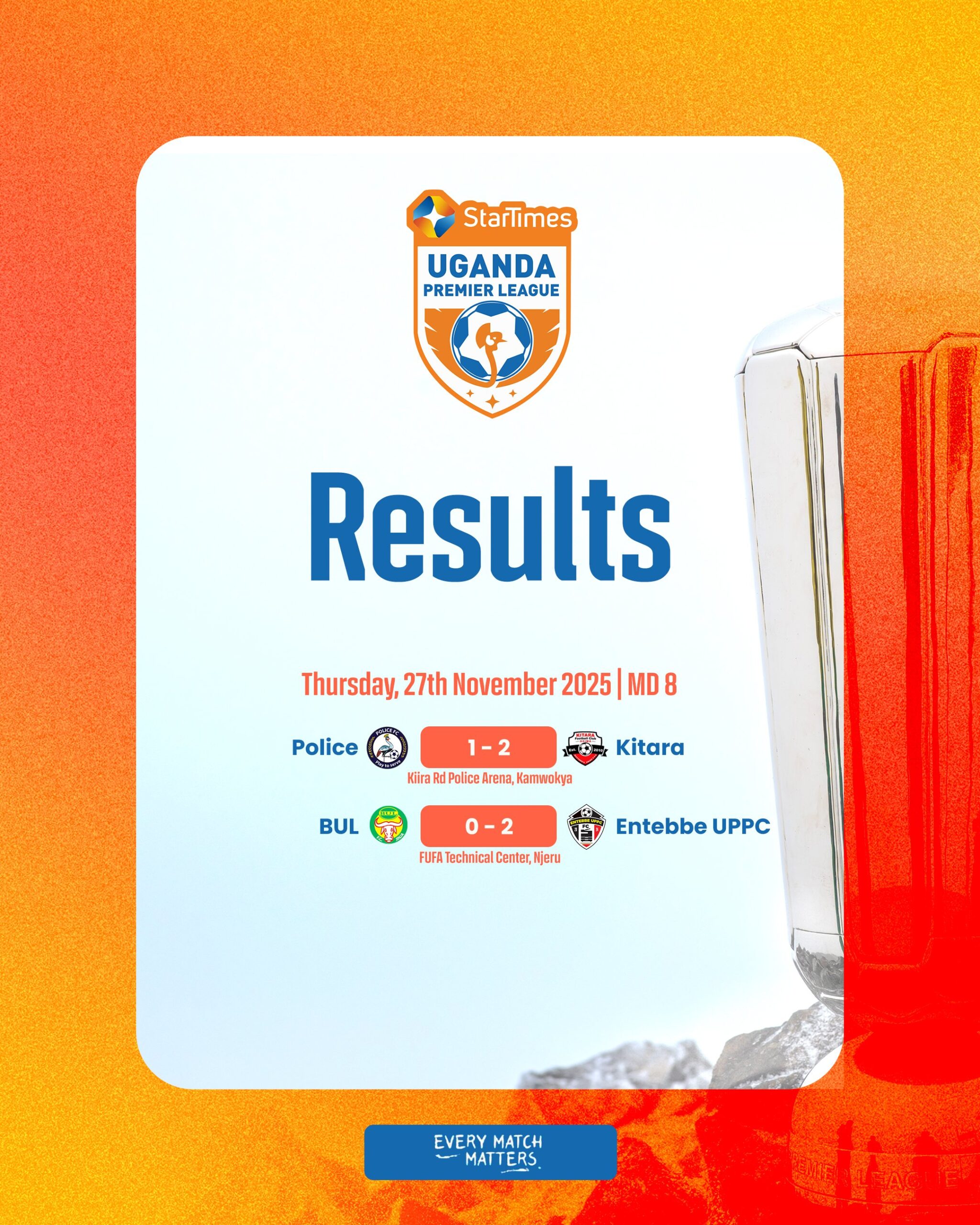 Official communications from the Uganda Premier League have confirmed the results of the matches played on Thursday. The league’s latest update indicates a day of decisive outcomes on the pitch. Across the two fixtures that took place yesterday, both encounters concluded with clear victories. This means that in each of the two highly anticipated games contested within the StarTimes Uganda Premier League on Thursday, definitive winners were recorded, with no draws reported.