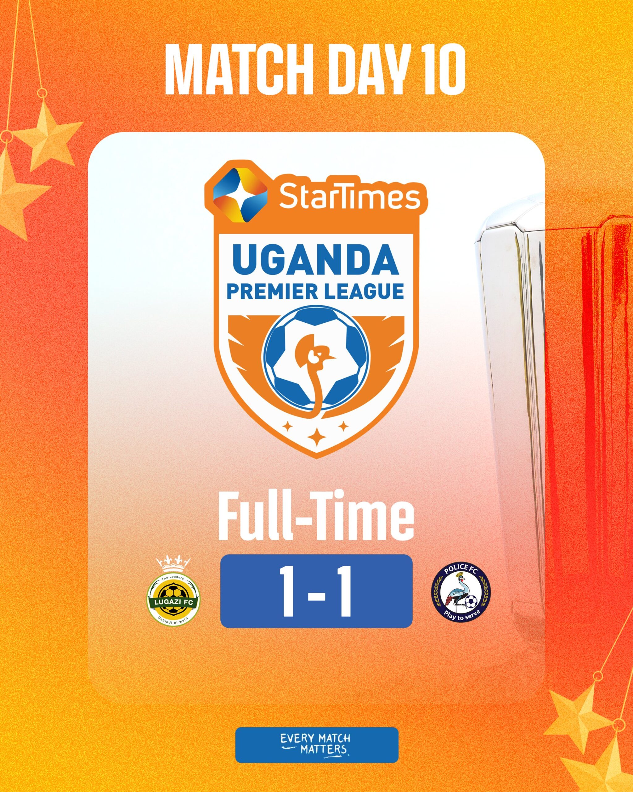 Good evening, this is Radio Ankole, 99.3 FM Ntungamo, with your sports update. The StarTimes Uganda Premier League saw a recent fixture conclude with a draw. At full-time, Lugazi Football Club and Police Football Club played to a one-all stalemate, with the final score standing at 1-1. Both teams shared the points from this competitive encounter.