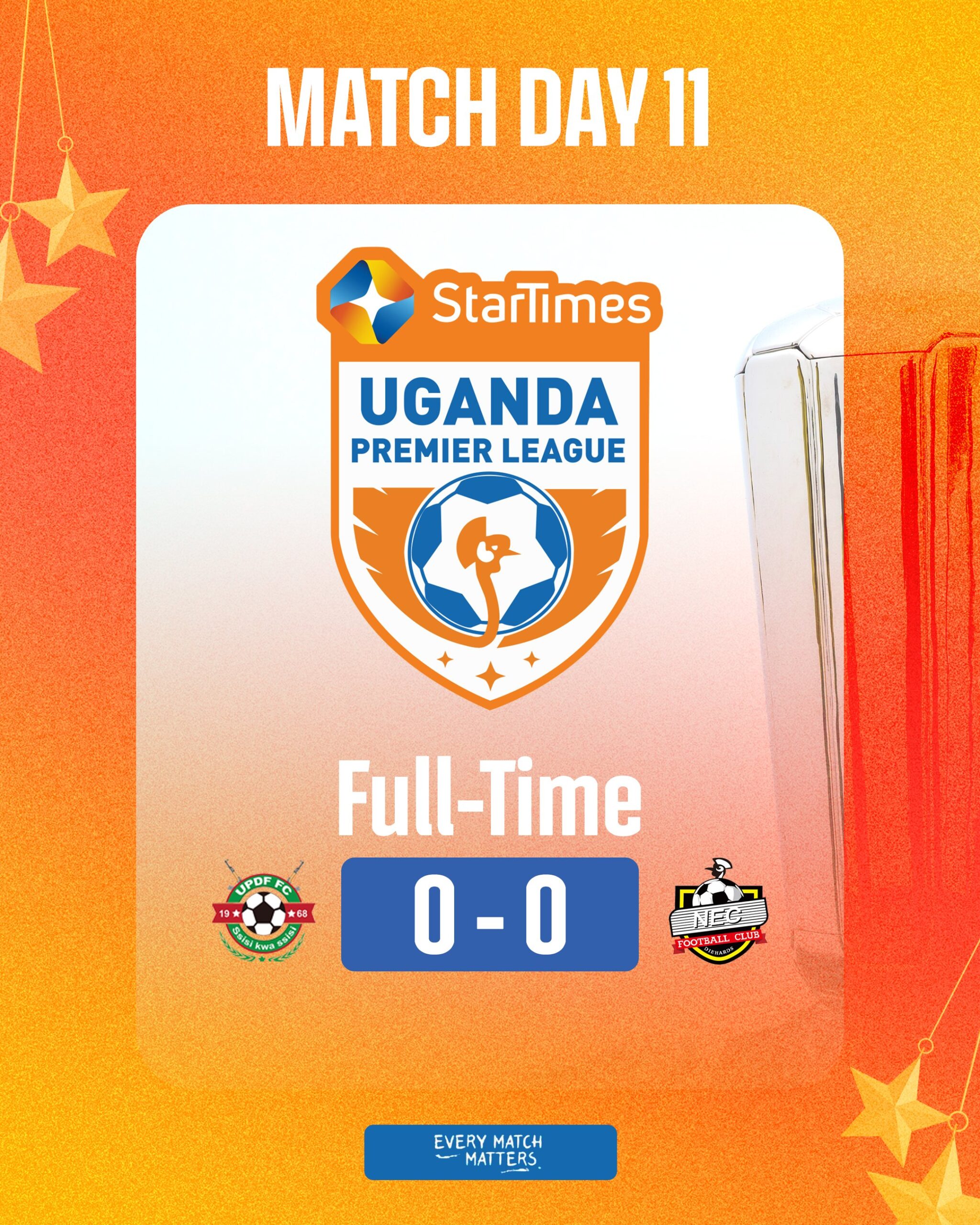 Good morning, listeners. This is Radio Ankole, 99.3 FM Ntungamo, with your sports update. In the latest action from the StarTimes Uganda Premier League, a closely contested match between UPDF Football Club and NEC Football Club concluded in a goalless draw. The final whistle confirmed a 0-0 stalemate, with neither side able to break the deadlock throughout the ninety minutes of play. Both teams ultimately shared the points from this encounter, as the full-time score remained unchanged from kick-off.